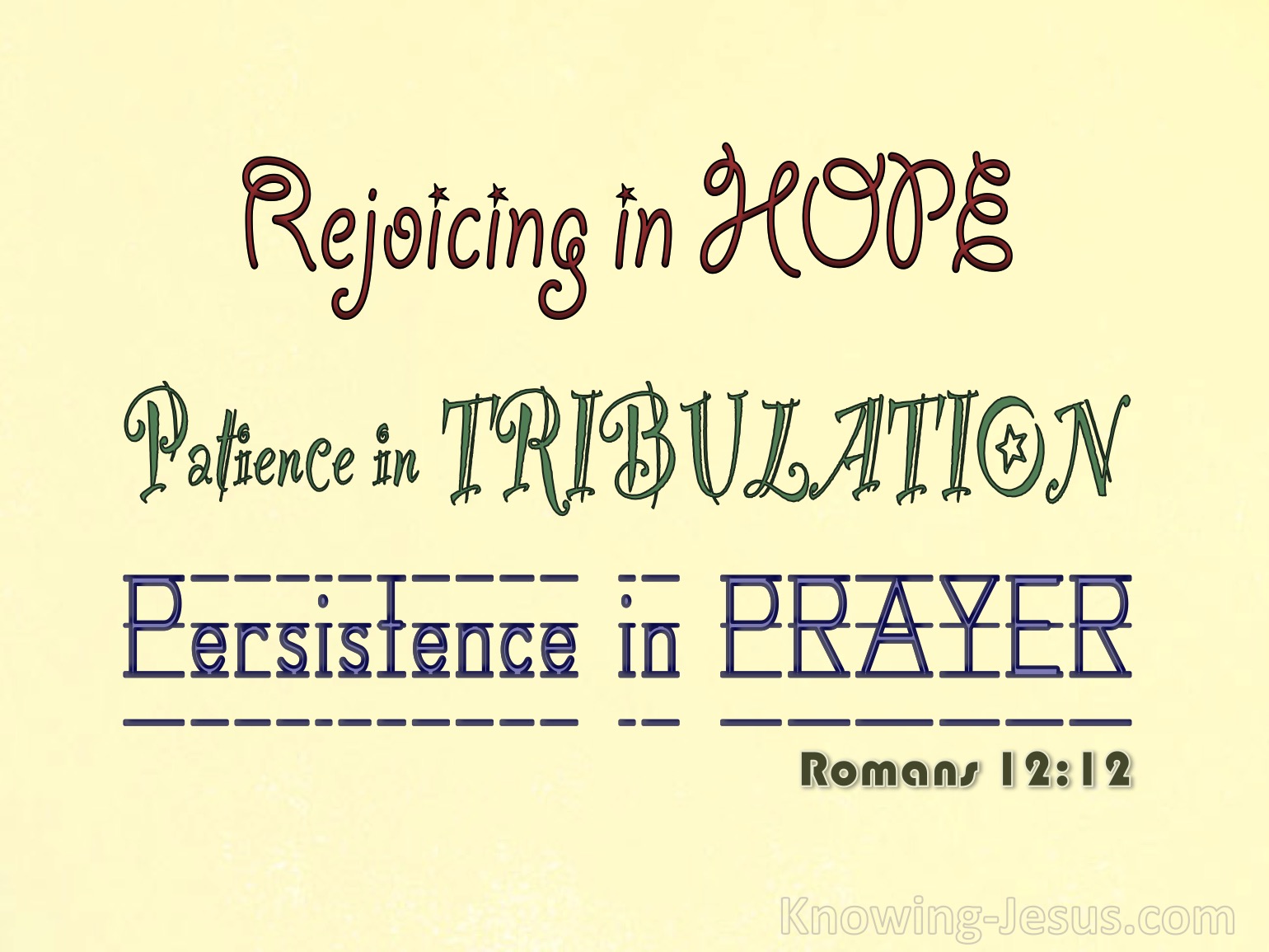 Romans 12:12 (NIV) says: “Be joyful in hope, patient in affliction, faithful in prayer.”