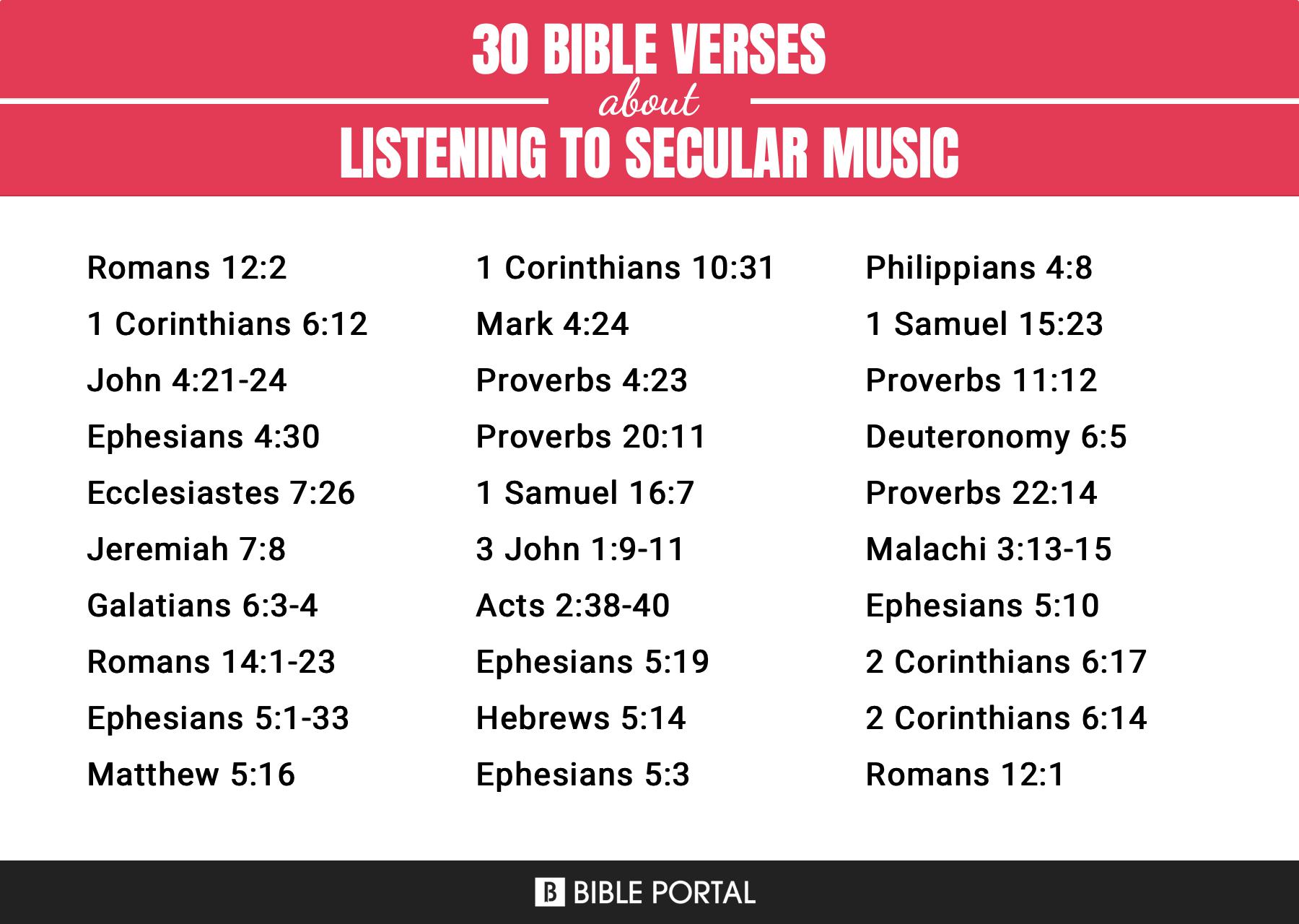 There is no specific Bible verse that explicitly states whether listening to worldly music is a sin. However, the Bible does provide principles and guidelines that can help Christians make wise decisions about the music they listen to.